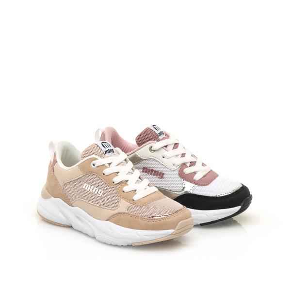Deportivo Mtng Kids para niña con diseño en varías texturas. Cierre de cordones planos y suela ligera para mayor comodidad, plantilla memory foam que amortigua la pisada. Que no se queden sin las deportivas Mustang las más peques de la casa.